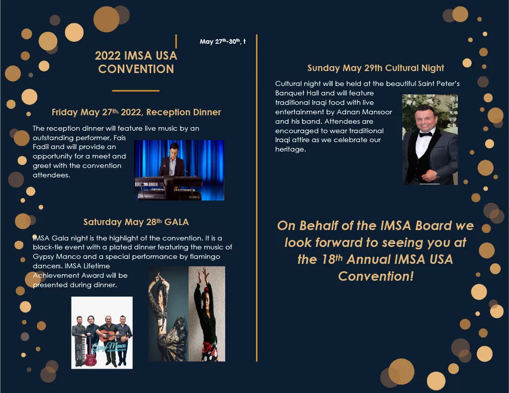 - Cultural night at St. Peter Hall featuring authentic buffet dinner with cultural live performance by singer Adnan Mansoor and his band. (traditional Iraqi attire recommended)